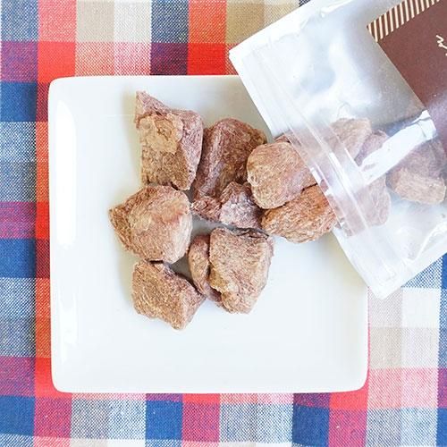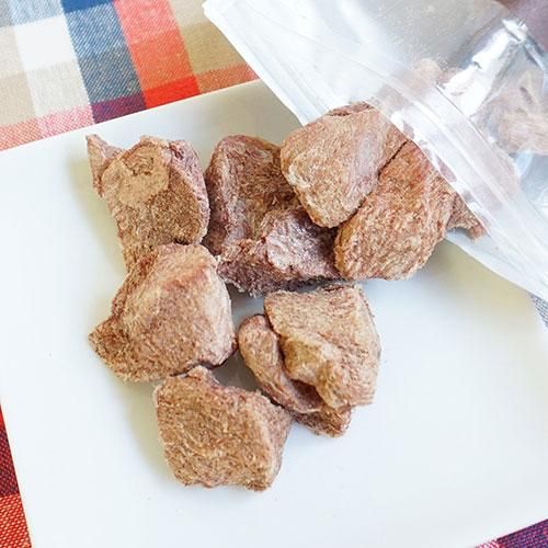 新鮮なお肉をそのままフリーズドライにしています。栄養そのままで、お湯で戻すと生肉をボイルしたような香りと食感が楽しめます。