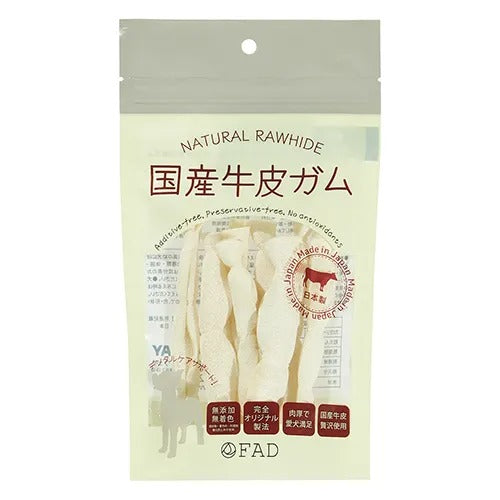 国内で食用に飼育された牛の皮を贅沢に使用。加工から管理まで、すべての工程を一貫して国内で行った、完全国産の無添加牛皮ガムです。