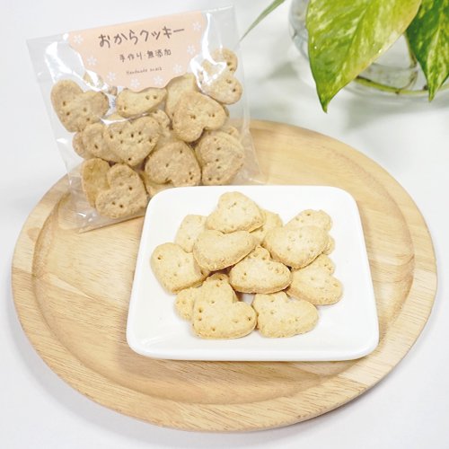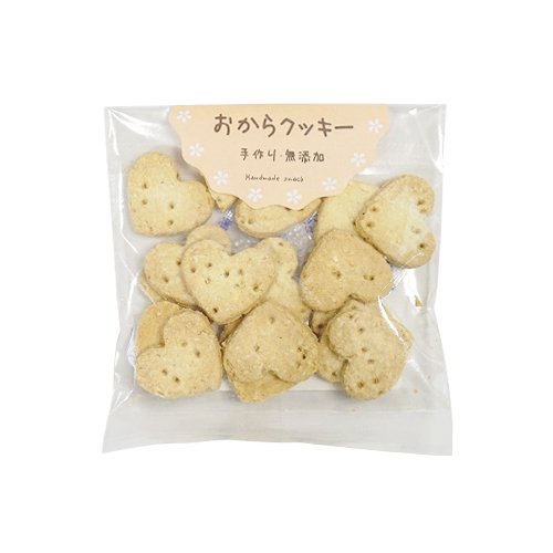 愛犬の身体に優しい無添加おからクッキー♪安心安全なおやつを手作りでお届けします。お豆腐屋さんの出来たての生おからを使用した、かわいいハート型のおからクッキーです。