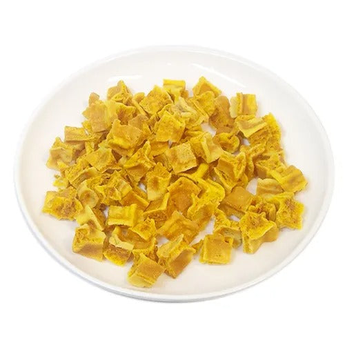秋田産無農薬かぼちゃを使用。かぼちゃのほんのりとした甘みが口の中に広がるワッフルラスクです。二度焼きしたワッフルを、小型犬でも食べやすい、ひとくちサイズのラスクにしました。