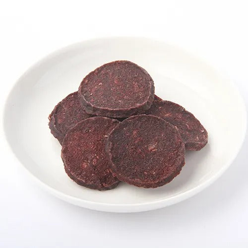 エゾシカ肉の旨味が凝縮したサラミタイプのジャーキー エゾシカ肉をミンチ肉にしてから棒状に成形し、食べやすい大きさにスライスしています。ワンちゃんに与えやすいおやつです。