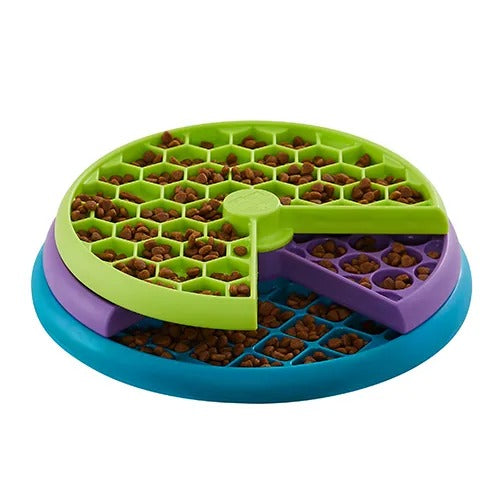 「Nina Ottosson トリーツ・ゲーム」シリーズの要素を含む、3層構造のスローフィーダー。