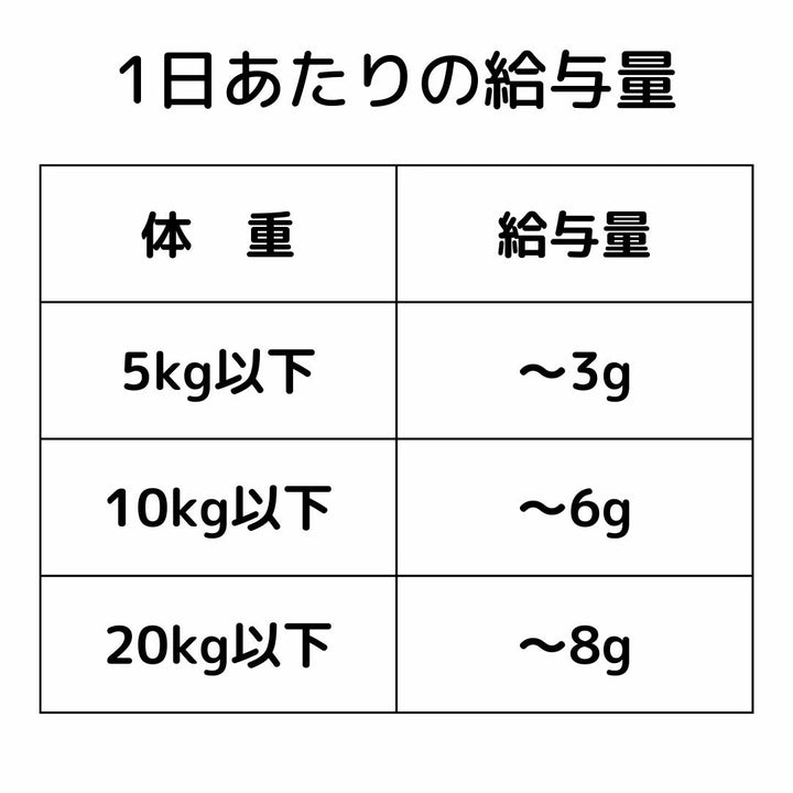給与量は、年齢・体重・体調及び、食事量を考慮し、摂取カロリーや愛犬の状態に応じて調節して下さい。