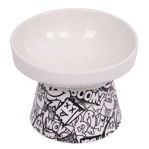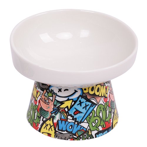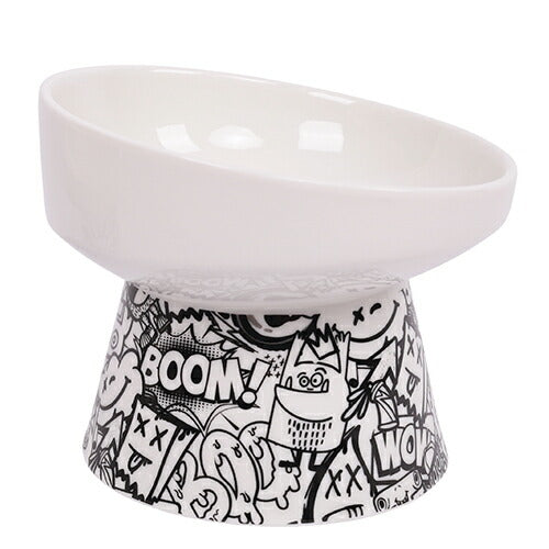 POPなグラフィックデザインがとってもおしゃれ!高さ&傾斜のある陶器製ボウル★高さがあるので首にかかる負担を軽減し、楽な姿勢で食事や水分補給ができる食器です。
