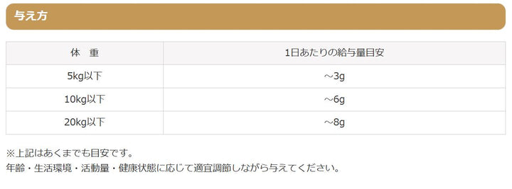 年齢・生活環境・活動量・健康状態に応じて適宜調節しながら与えてください。