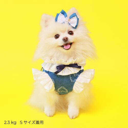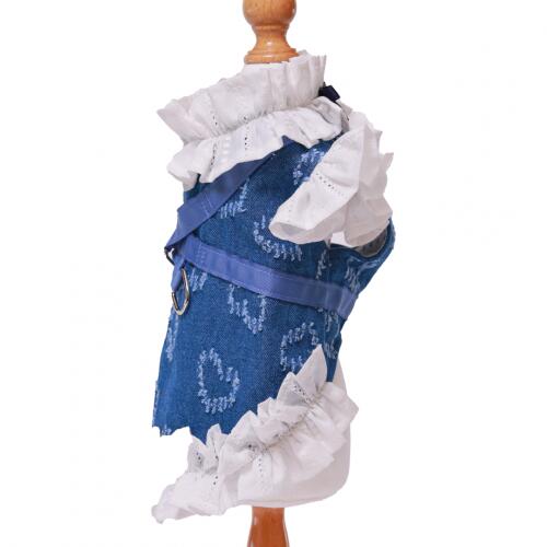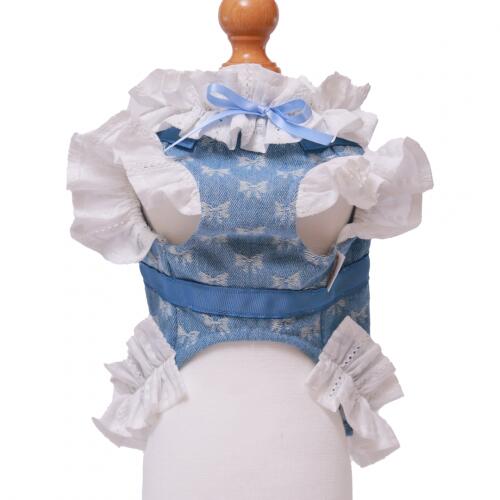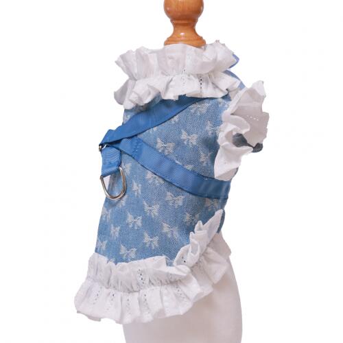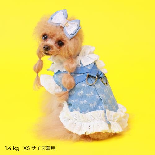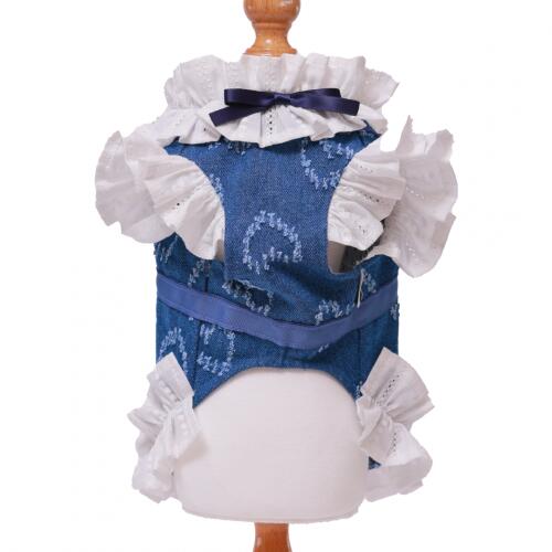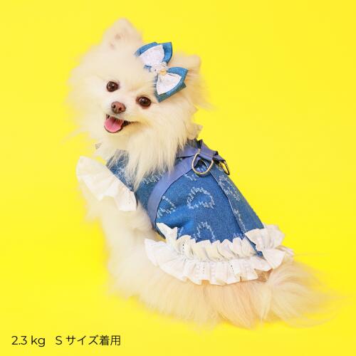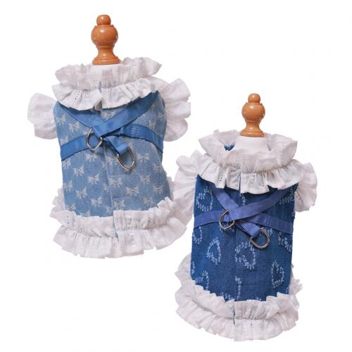 まるでお洋服のようなかわいいハーネス!ハート柄とリボン柄のデニムにコットンレースを合わせました