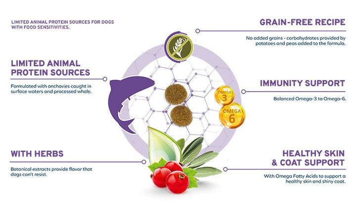 カタクチイワシ、じゃがいも、じゃがいも澱粉、じゃがいもプロテイン、魚油(ミックストコフェロールで保存)、精製鶏脂、全エンドウ豆、炭酸カルシウム、加水分解された動物性蛋白質、乾燥ケルプ、フラクトオリゴ糖、ローズヒップ、クランベリー、ユッカシジゲラ、ビタミンA、塩化コリン、タウリン、DL-メチオニン、ビタミンE、硫酸亜鉛一水和物、銅アミノ酸キレート、ナイアシン、ローズマリーエキス、D-パントテン酸カルシウム、リボフラビン、ピリドキシン塩酸塩、チアミン塩酸塩、葉酸、ビタミンB12