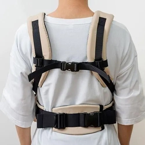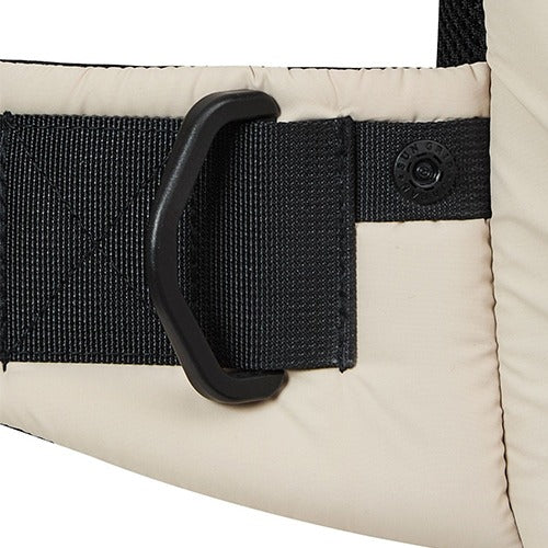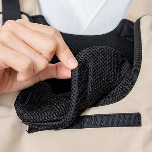幅広のショルダーベルトとウエストベルトが、肩や腰への負担を軽減する前抱き専用キャリーバッグ