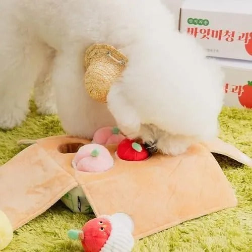 ふわふわで噛みやすい綿入りフルーツが6個!ピーピー音、カシャカシャ音、ノーズワークが1つで楽しめる