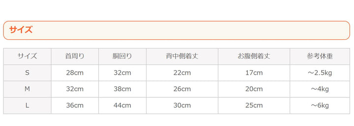 サイズ 首周り 胴回り 背中側着丈 お腹側着丈 参考体重