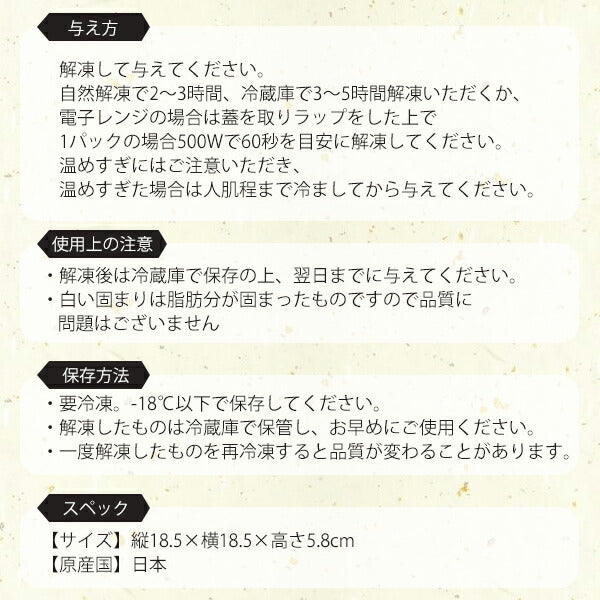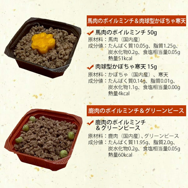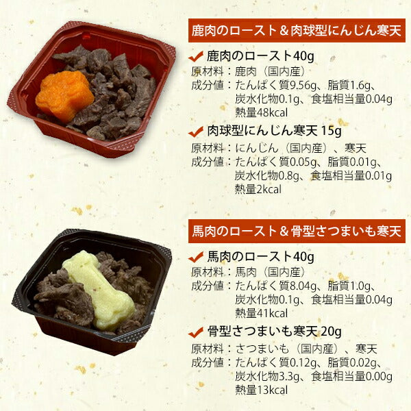 | お品書き | ・鹿肉のロースト&肉球型にんじん寒天 ・馬肉のロースト&骨型さつまいも寒天 ・馬肉のボイルミンチ&肉球型かぼちゃ寒天 ・鹿肉のボイルミンチ&グリーンピース 各メニューの詳細は商品画像にてご確認下さい。 |