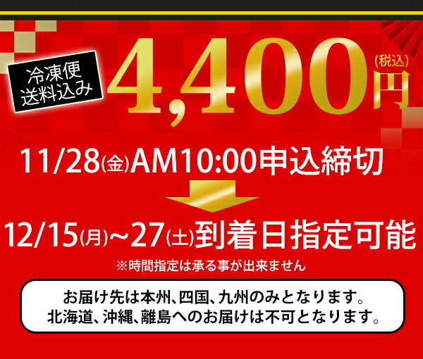 11/28AM10:00までのお申込みとなります。 お届けは12/15〜12/27でご指定頂けます。(時間指定は承る事が出来ません) 冷凍便。、送料無料でお届けします。 |